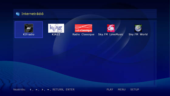 Másold fel a fenti könyvtárszerkezetet pl. egy pendrive-ra, majd csatlakoztasd a Dune-höz, és próbáld ki a működését, akár másold is be a főképernyőre kitett Internetrádió mappába (lásd fentebb)! Ha jól csináltad, valami ilyesmit fogsz látni, ha rákattintasz az Internetrádió ikonra: