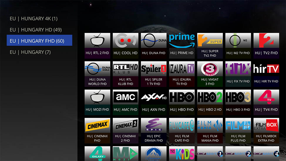117 csatorna van magyar nyelvűnek jelölve, de ezek között továbbra is van néhány „tévedés”, ami vagy nem elérhető idehaza, vagy csak a Global TV kínálja fel hibásan, nem magyar hangsávval, de a lényeg, hogy nem (vagy nem mindig?) magyarul szólalt meg, amikor elindítottuk. Ezek jellemzően olyan globális tévécsatornák, amelyek Európa több országában is azonos műsort adnak, de különböző nyelvre szinkronizálva. Talán a Global TV készítői nem ismerték fel helyesen ékes nyelvünket, amikor beállították és kategorizálták az elérhető stream-eket. A négy kategória – amelybe rendezve megtaláljuk a hazai adókat – sem pontos, mivel mindegyikben találunk fullHD felbontású adást (sőt, talán az adók 90+ százaléka ilyen végre), és a 4K-s csoportban került 1 darab tévécsatorna se nem magyar, se nem 4K-s (bár találtunk valódi 4K felbontású adót a külföldi kínálatban).