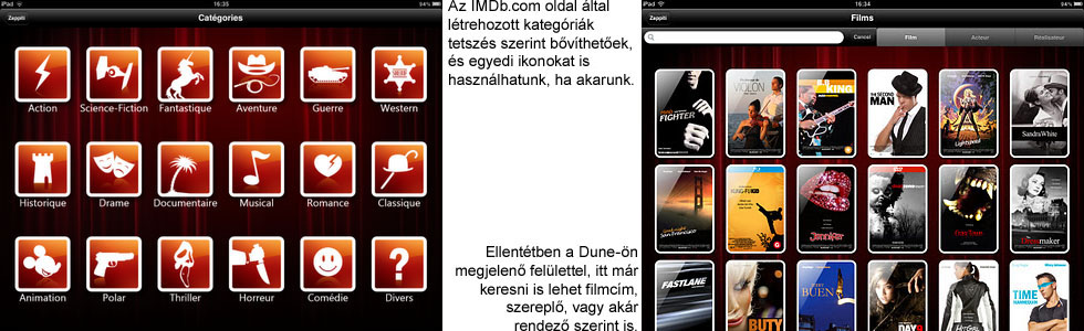 Az iPhone/iPad alkalmazás segítségével a mobilunk képernyőjén jelenik meg a végeredmény, nem (csak) a tévén, így kényelmesebben, és gyorsabban böngészhetjük a filmeket, könnyebben olvashatujk a leírásokat. De ami a legfontosabb, és nem működik a Dune-ön megjelenített verziónál: keresni is lehet a filmek között (kategóriára, megjelenési dátumra, rendezőre, szereplőre, filmcímre):